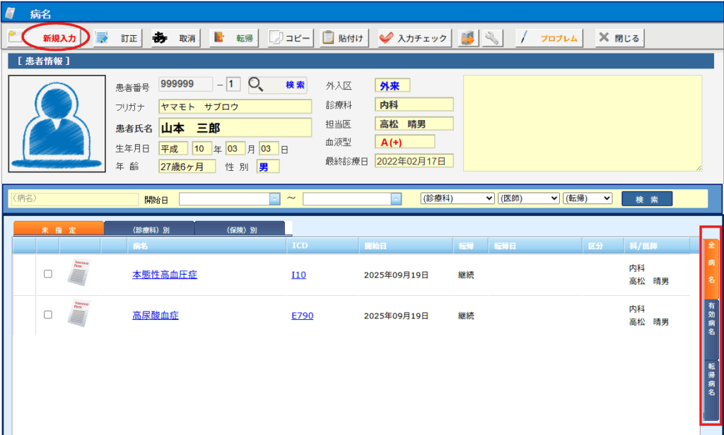 画面右側のタブをクリックすることで、[全病名]・[有効病名]・[転帰病名]を切替えでき