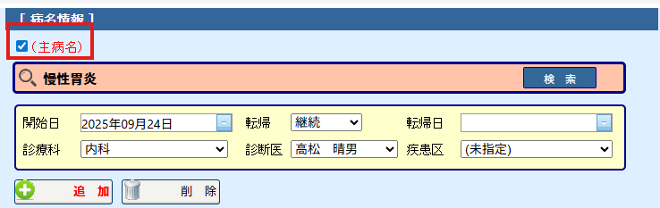 (5)入力された病名が主病名の場合は[(主病名)]にチェックを入れてください。