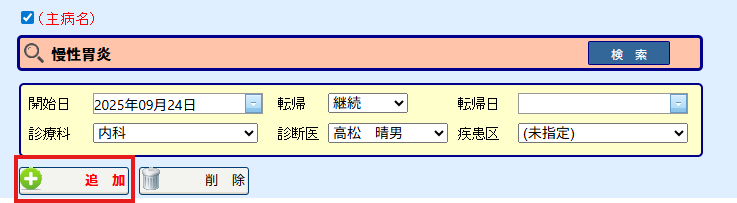 (6)病名の入力が終わりましたら[追加]ボタンを選択して下さい。