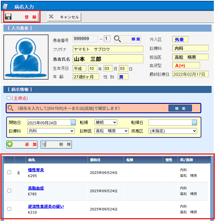 (7)病名が追加されます。※複数病名がある場合は上記の手順を繰り返す形となります。