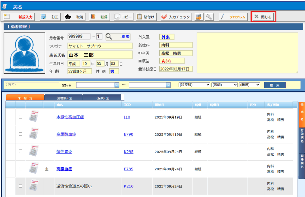 (8)病名が登録され[病名画面]が表示されます。[カルテ]画面に戻られる場合は[閉じる]