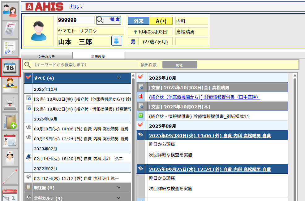 (1)カルテ画面より縦メニューより[予約](カレンダーのアイコン)を選択して下さい。