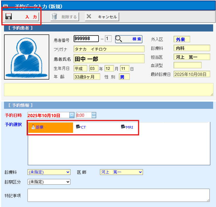 ※患者・予約日時は自動的に表示されます。医師は担当医が表示されますので異なる場合は