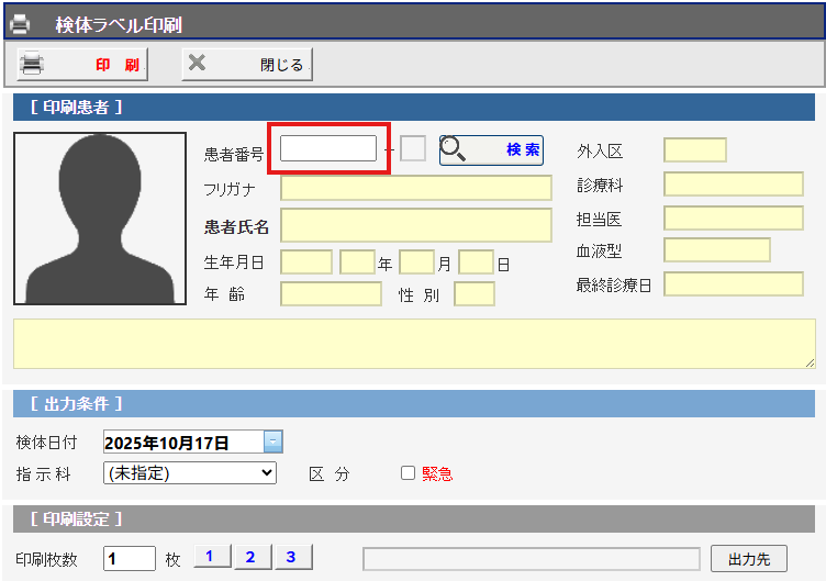 AHISでは外注検査依頼の際の検体ラベルを発行できます。(検体ラベル発行用ラベルプリンタを導入されている場合となります)