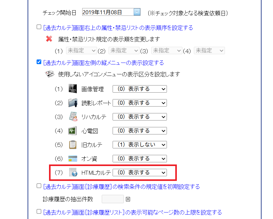 2. [オプション設定]画面の[(過去カルテ)画面左側の縦メニューの表示設定]欄の[HTMLカルテ](0:表示する)に設定します。