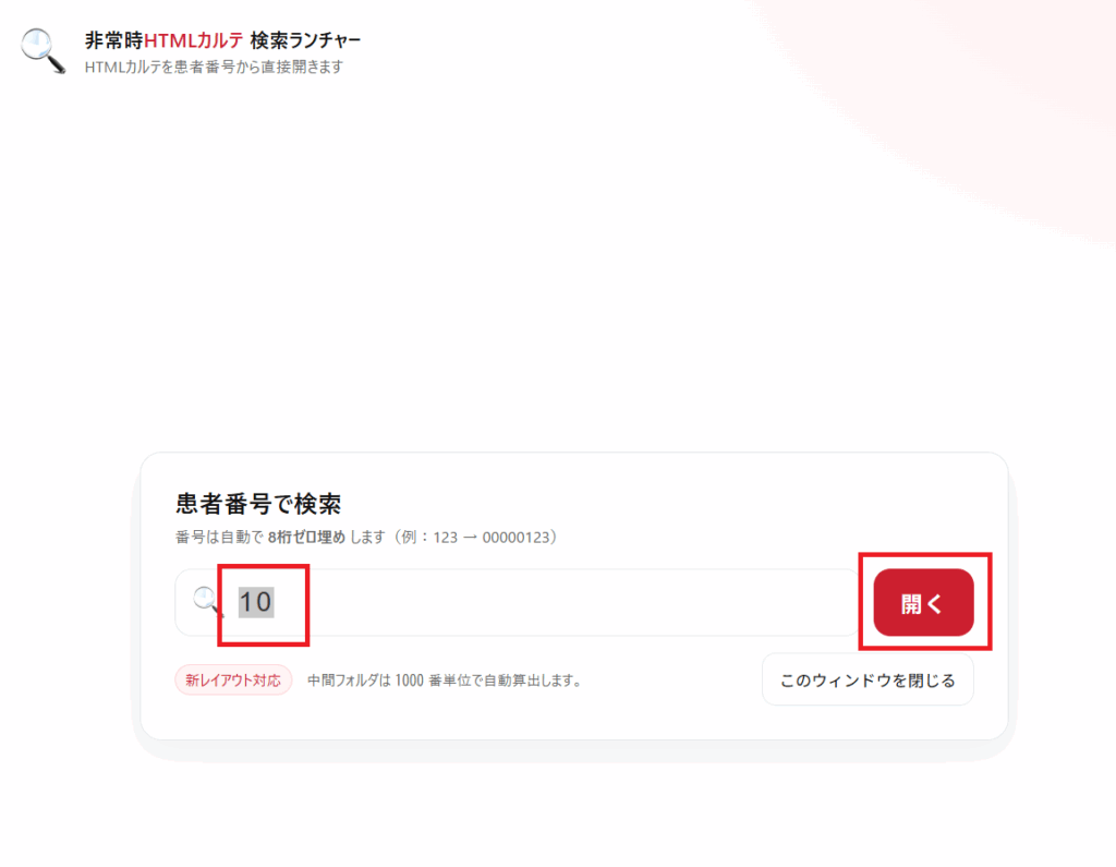 [患者番号]を入力して、[ENTER]キーもしくは[開く]ボタンを選択します。
