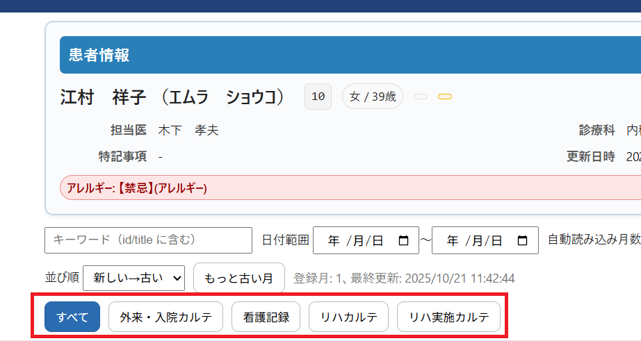 4. 下図の記事分類タブを選択することで、医師カルテ・看護記録・リハカルテなど表示するカルテを絞り込みすることができます。