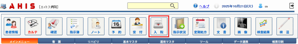 AHISでは、入院患者の入退院・転床/転棟・外出/外泊の管理をメインメニューの[入院]から行います。