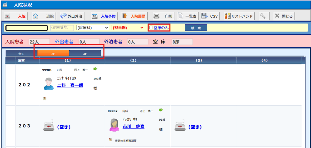 ※[空床のみ]をチェックすることで空き病室のみを表示させることも出来ます。