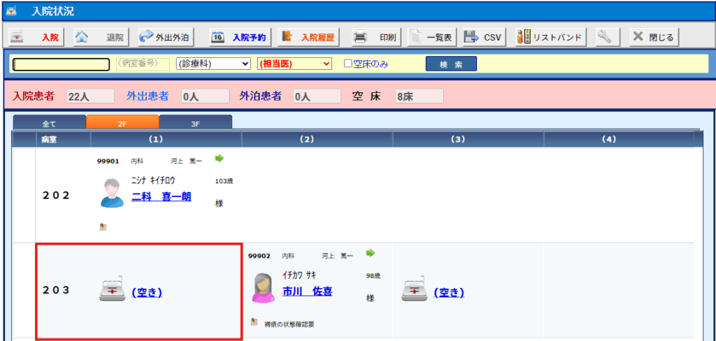 (3)空床は(空き)と表示されますので入院登録は該当の(空き)ベッドを選択します。