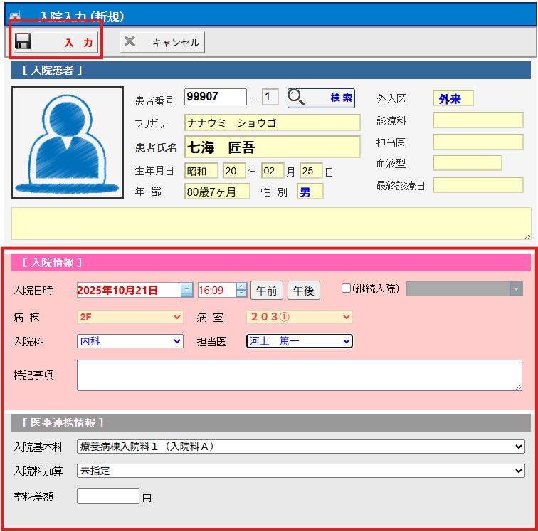 [入院日時]、[病棟]、[病室]などの項目が正しく設定されているか確認のうえ、[入力]を選択