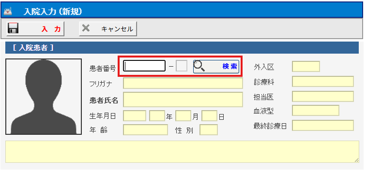 (4)入院入力(新規)の画面が表示されますので入院する患者を患者番号か検索より選択して
