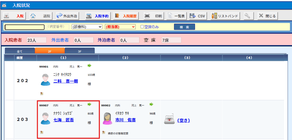 (6)入院状況画面に戻ります、先ほど入院登録され患者が表示されます。