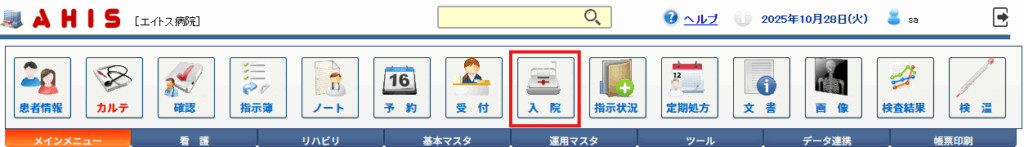AHISでは、入院患者の入退院・転床/転棟・外出/外泊の管理を、メインメニューの[入院]から行います。