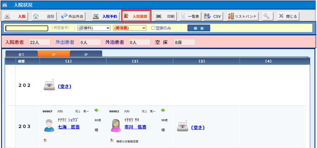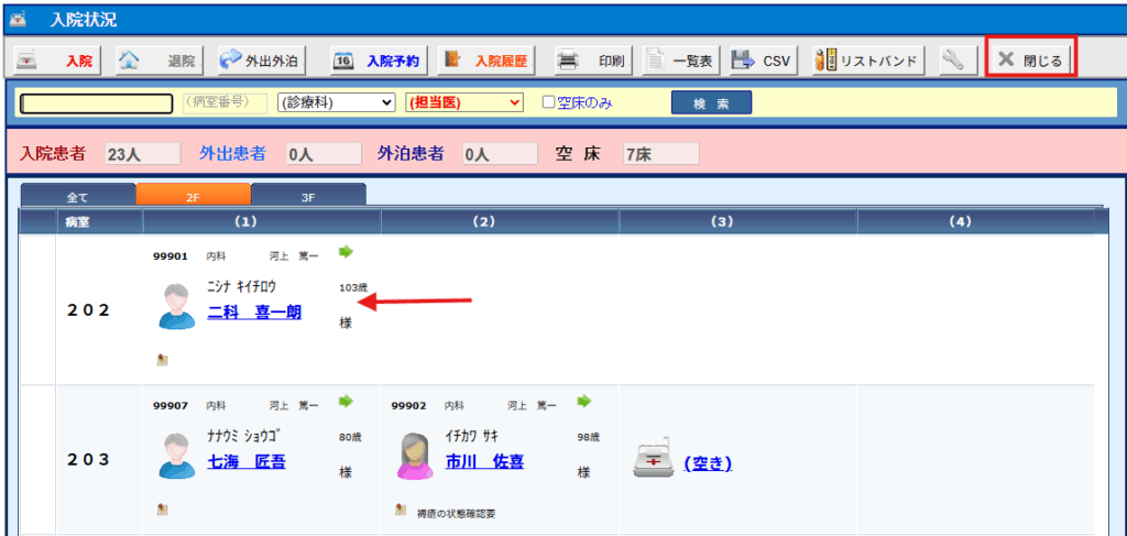 (7)入院状況の画面が表示されます。退院処理を取消した患者が入院中になったいることを