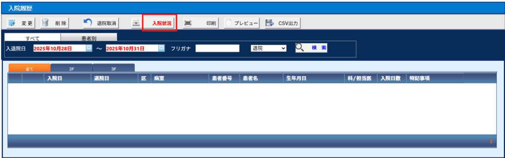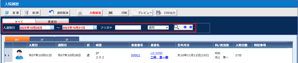 (3)入院状況の画面が表示されます。入退院日・フリガナ・入退院区分等を指定し該当の患者