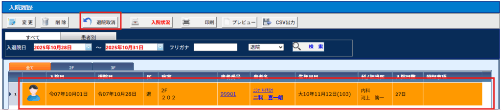 (4)表示された患者を指定して[退院取消]を選択して下さい。