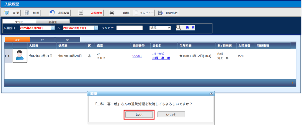 (5)退院処理取り消しの選択肢が表示されますので[はい]を選択して下さい。