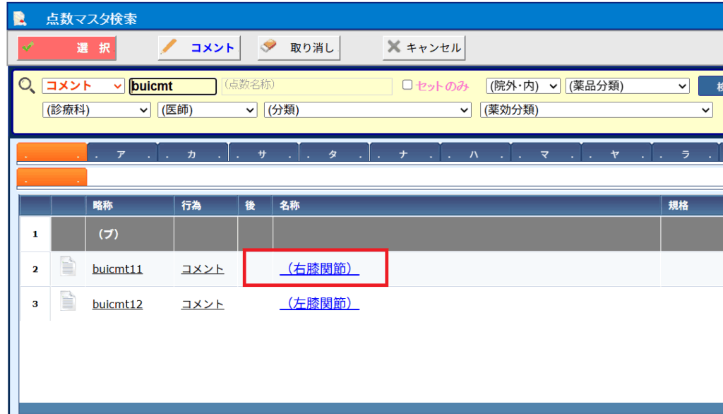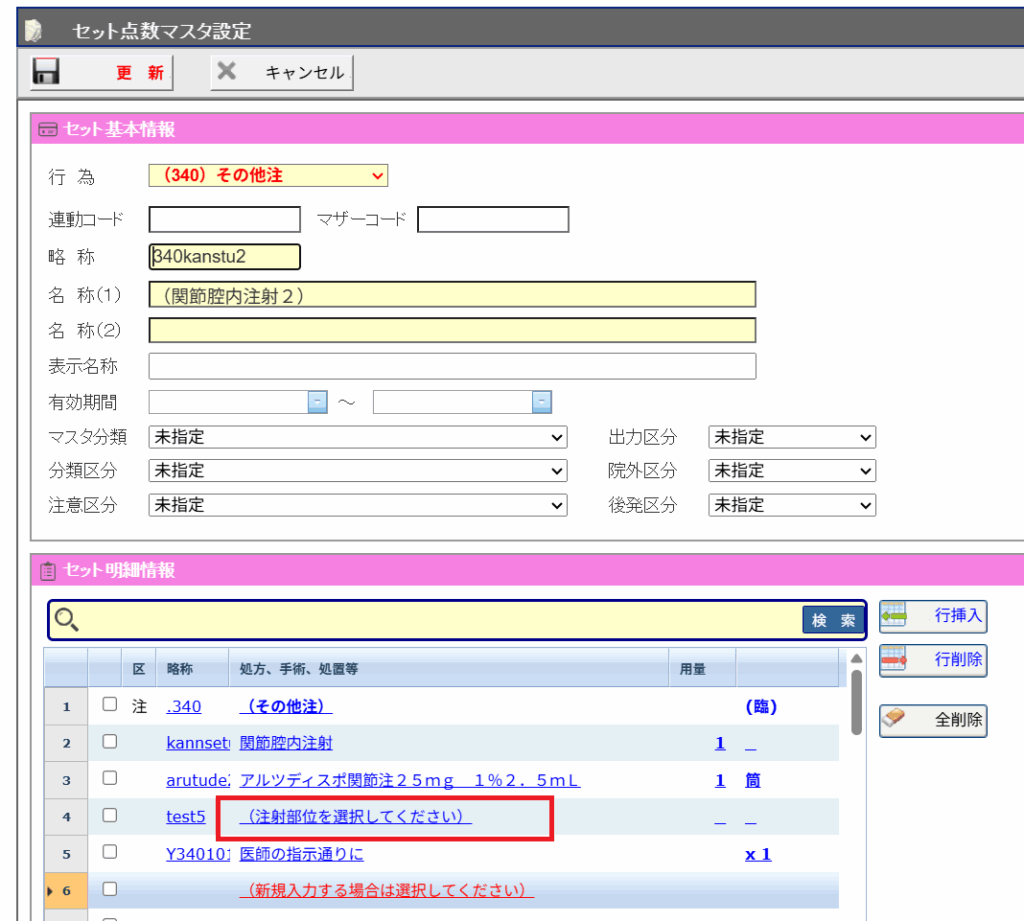 例として関節腔内注射のセット内に、下図のように医薬品の次行に選択肢コメントが来るような形で登録してみます。