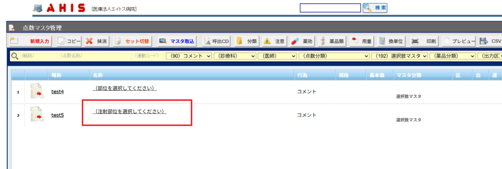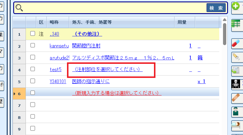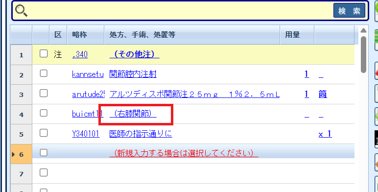 11. 下図のように[カルテ入力]画面で該当のセットを入力して、今回追加した選択肢マスタの行を選択します。