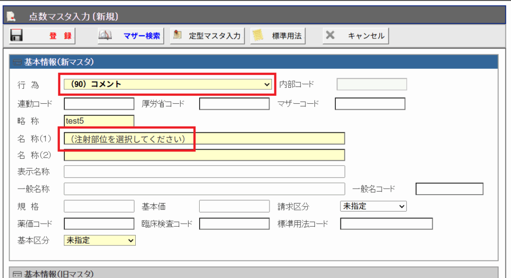 2. [点数マスタ入力]画面で、通常の固定コメントを登録する手順と同じく、まずは(行為:90コメント)選択してから、(略称)(名称)を入力します。