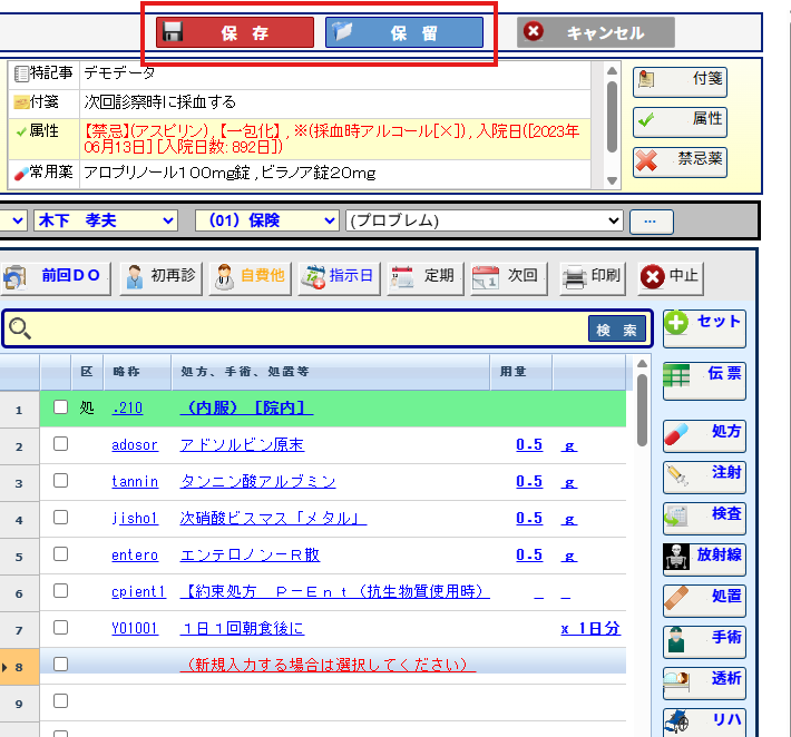 (1)カルテ画面より診療内容の入力が完了しましたら[保存]又は[保留]を選択します。