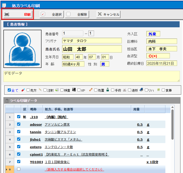 (2)処方ラベル印刷の画面が表示されますので、[印刷]を選択して下さい。