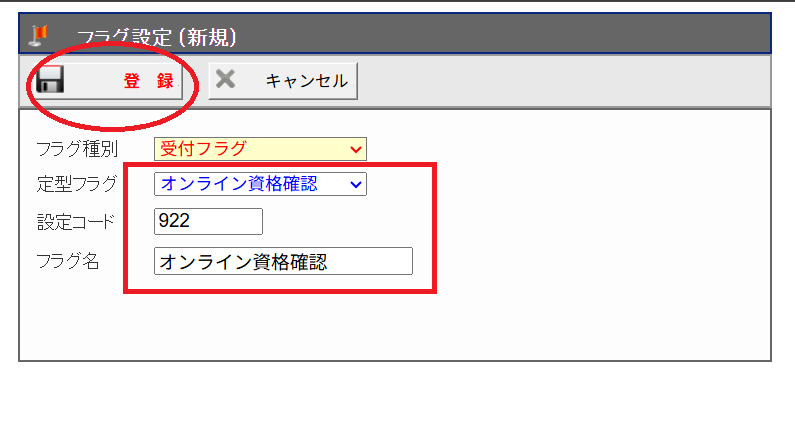 (オン資)マイナ診察券を有効にして、仮受付の登録時にフラグの自動設定をする場面で、対象となる定型フラグの設定方法について説明します。
