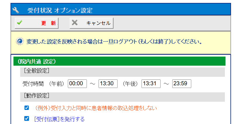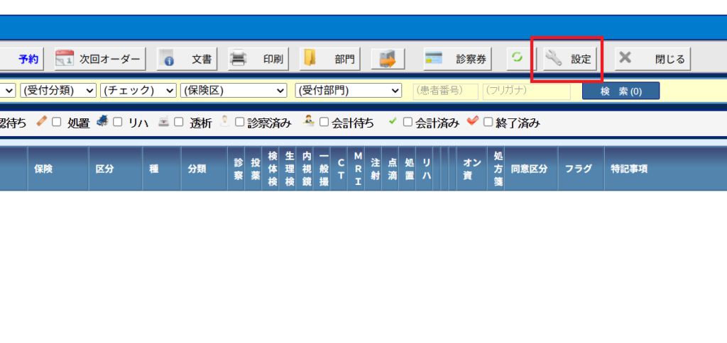(オン資連携の)マイナ診察券が有効な場合に、受付一覧に資格確認結果(資格有効・無効の有無)をアイコン表示させることが出来ます。ここでは受付のオプション設定の手順について説明をします。