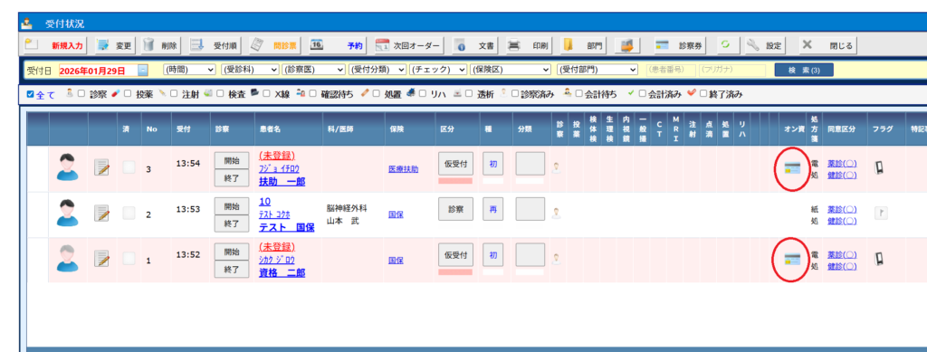 4. 顔認証(オンライン資格確認)と連携して登録された受付データは、下図のように(オン資)列に各アイコンが表示されるようになります。