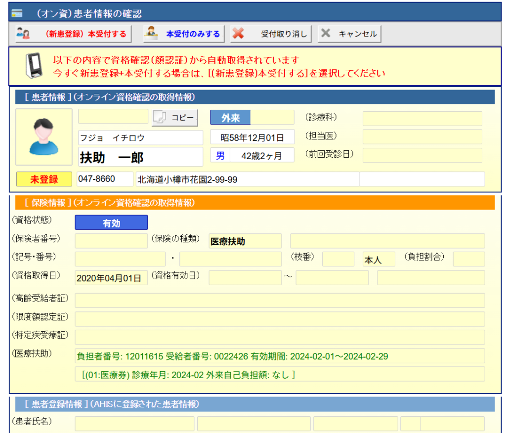 5. 資格アイコンをクリックすると、下図のように(オン資から取得された)[患者情報の確認]画面が表示されます。