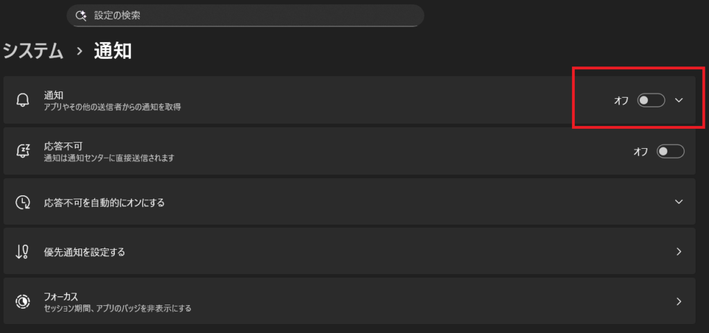 2. [通知設定]画面が表示されます。下図のように[通知](オフ)になっている場合は、(オン)に切り替えてください。