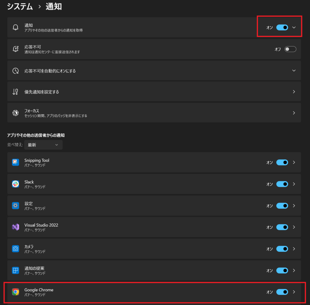 3. 続けて、アプリごとの通知許可の箇所で、[GoogleChrome](オン)になっているかどうか確認してください。