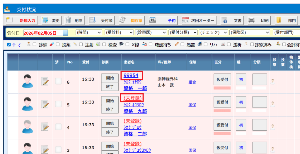 3. 下図のように再来の方は患者番号が表記されますが、新患の方は(未登録)と表記されます。