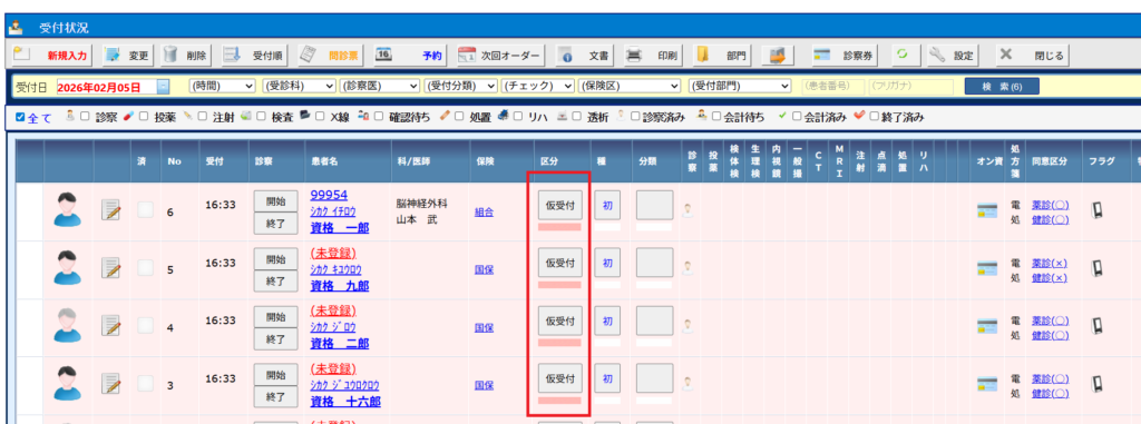 2. 下図のように[受付状況]画面に(仮受付)ステータスの受付患者が自動で表示されます。