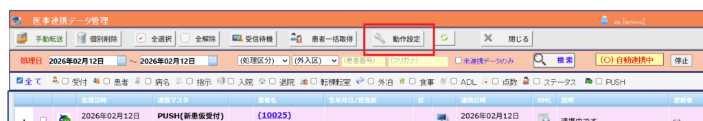 1. (データ連携)[医事連携]のメニューから[動作設定]を選択します。