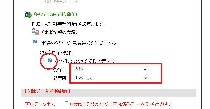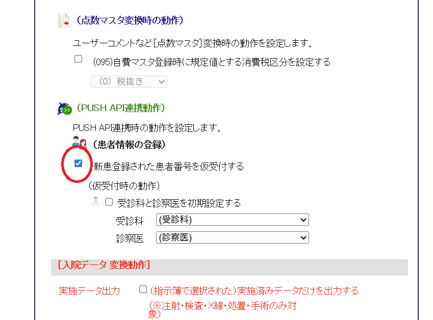 2. [動作設定]画面の(PUSH API連携動作)(患者情報の登録)[新患登録された患者番号を仮受付する]にチェックを入れます。